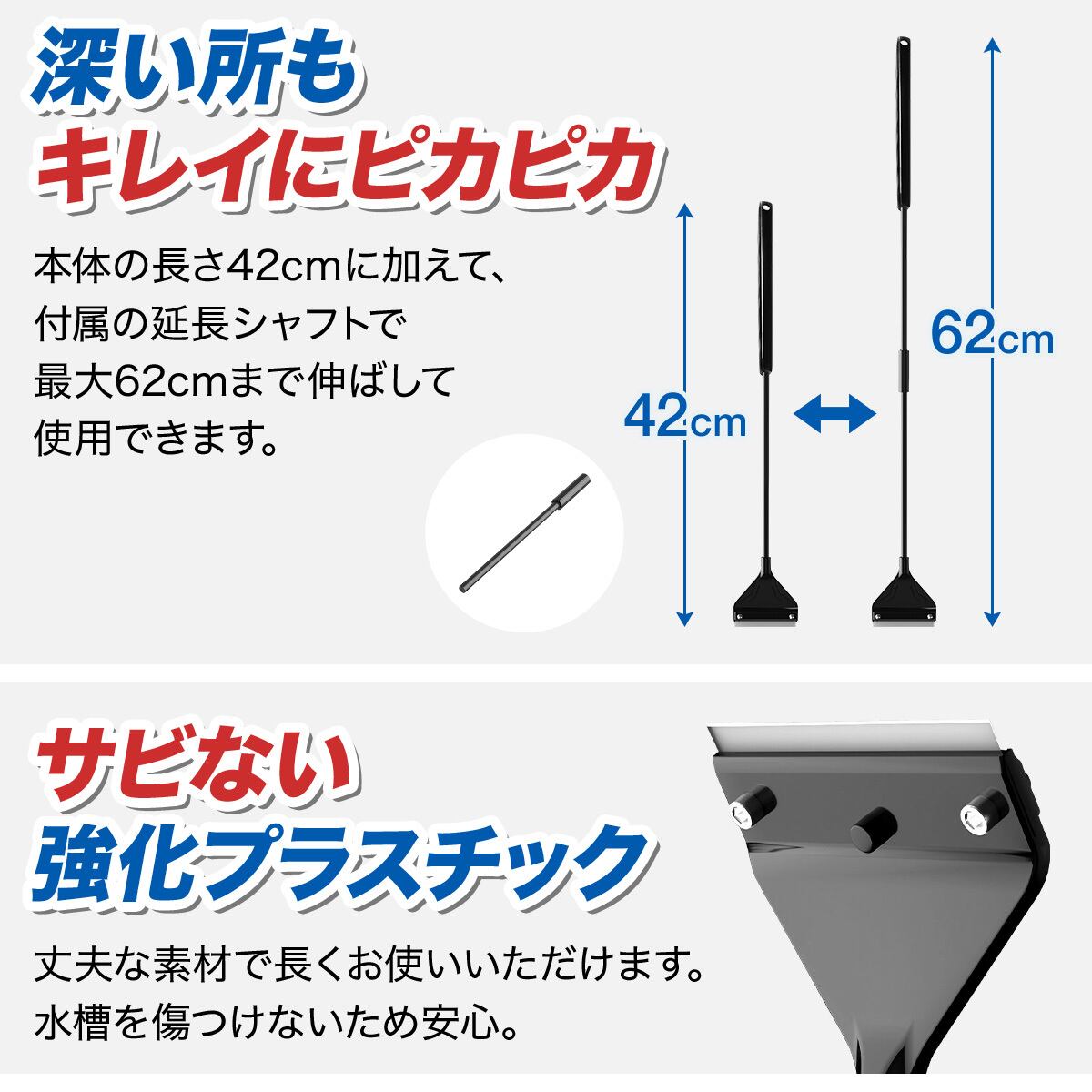 本体42cm+延長パーツで最大62cm。水槽の深い所までピカピカにする事ができます。