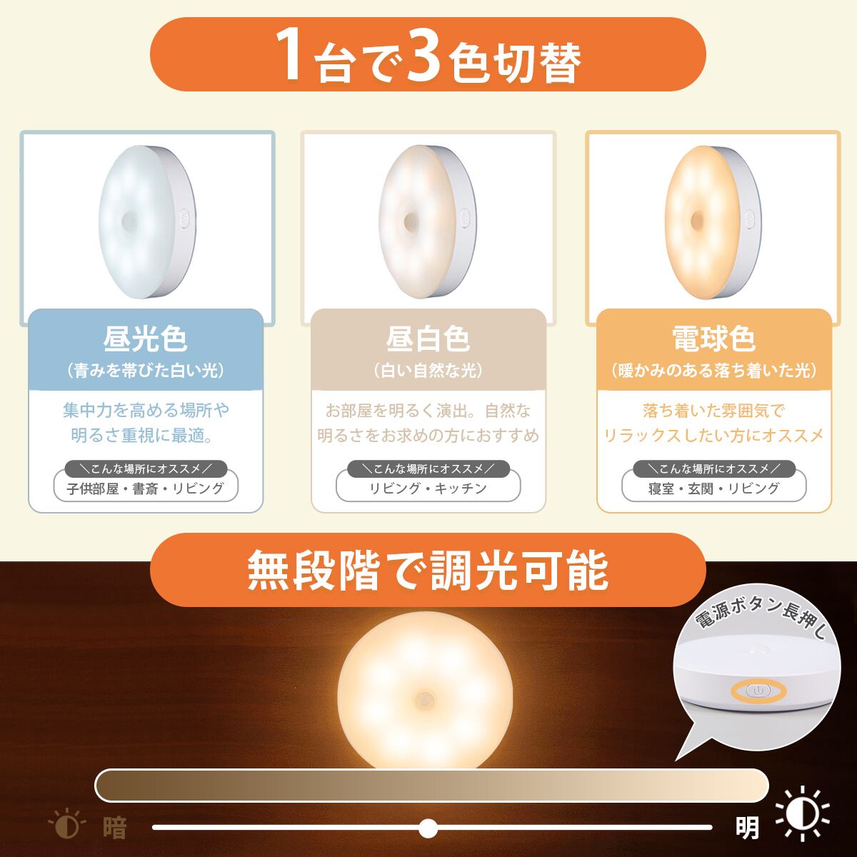 「昼光色」「昼白色」「電球色」の3カラーに切り替える事ができ「調光」も可能です。