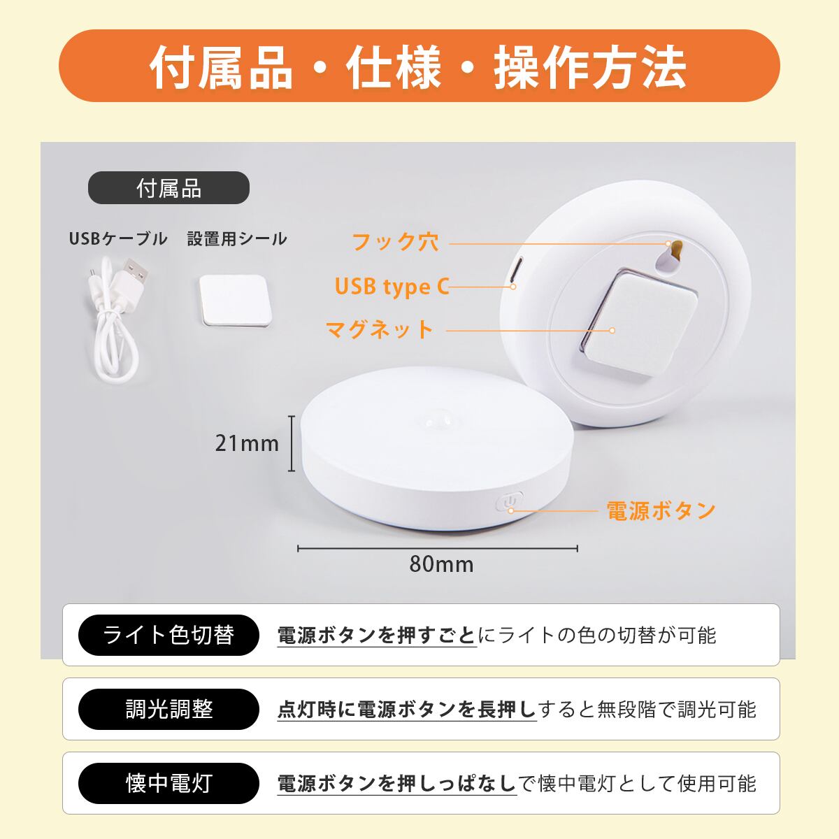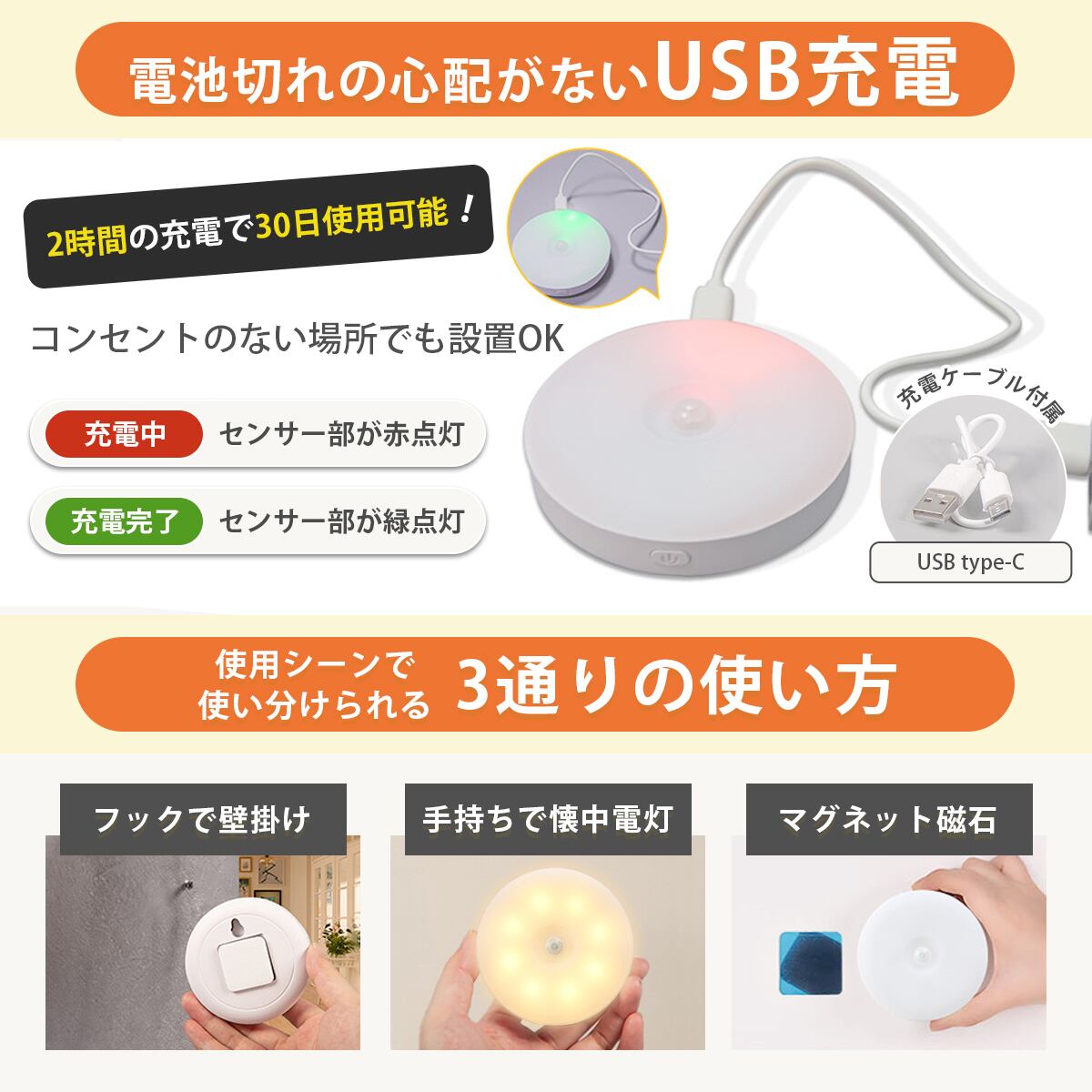 マグネットで取り付け、フックで壁掛け、手持ちで懐中電灯の3通りの使い方が出来ます。